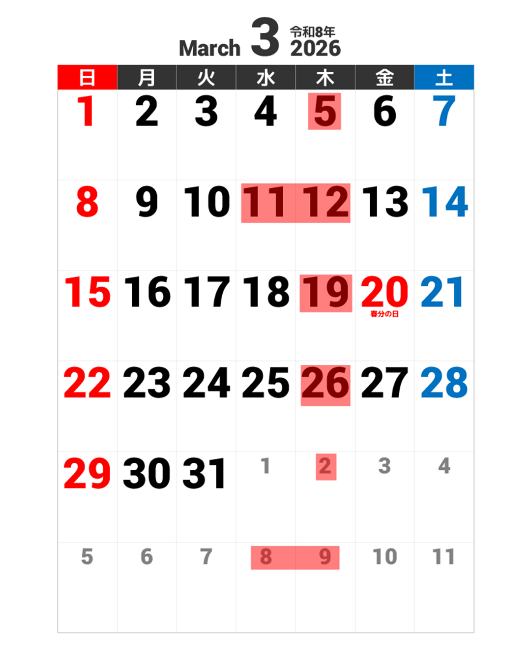 2026年3月営業カレンダー